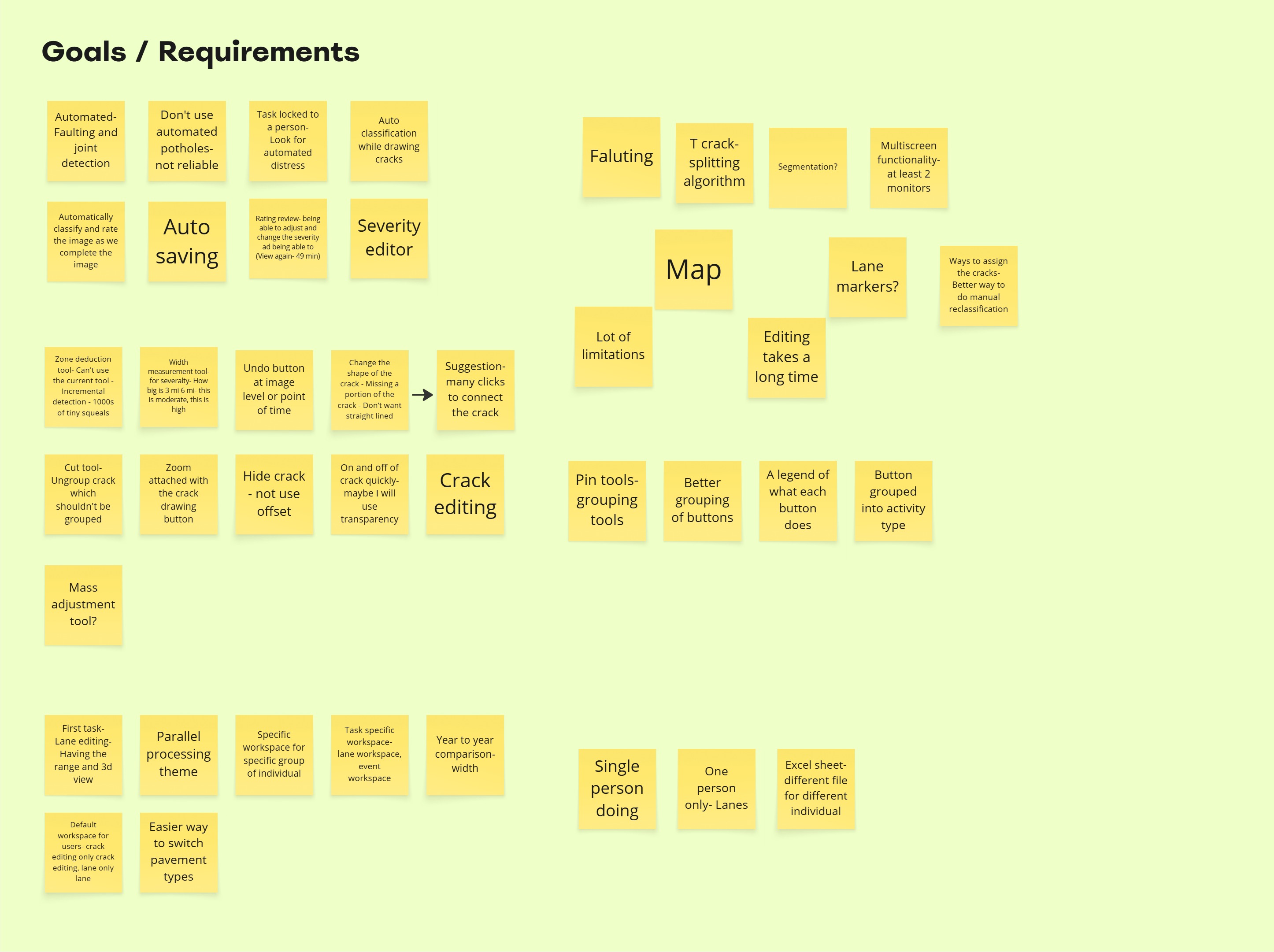 Before conducting field observations, I reviewed recordings and documentation from an earlier discovery workshop that involved Operations Leads, Delivery Managers, and Technical Supervisors. This secondary research helped establish a high-level understanding of existing workflow challenges, business goals, and system limitations within the pavement data processing pipeline. It revealed recurring concerns about long processing times, inconsistent data quality, and the lack of standardization across teams. Stakeholders also emphasized the need for stronger automation, better visibility into year-over-year data, and a simplified process that could scale efficiently across both on-shore and off-shore teams.