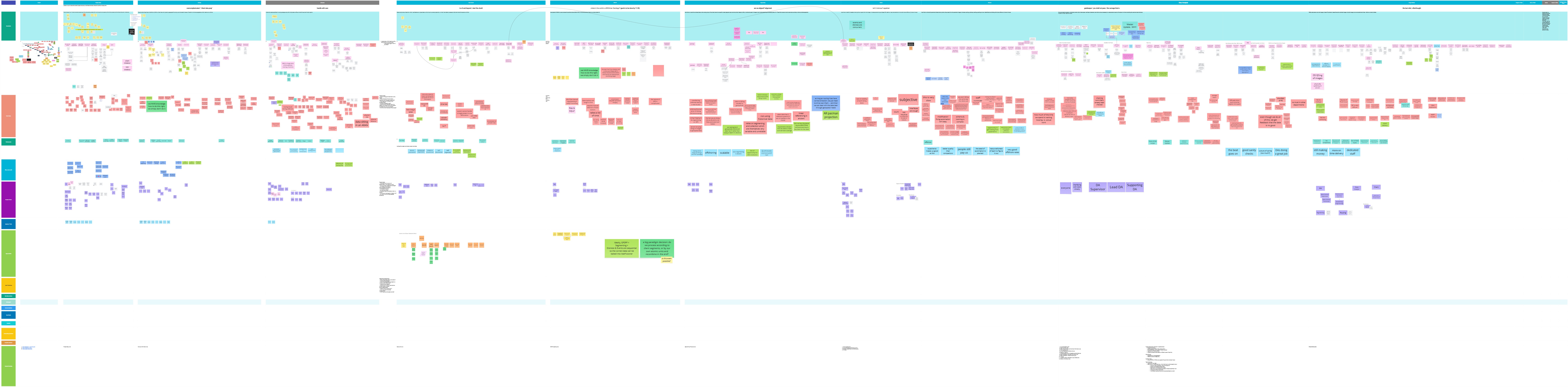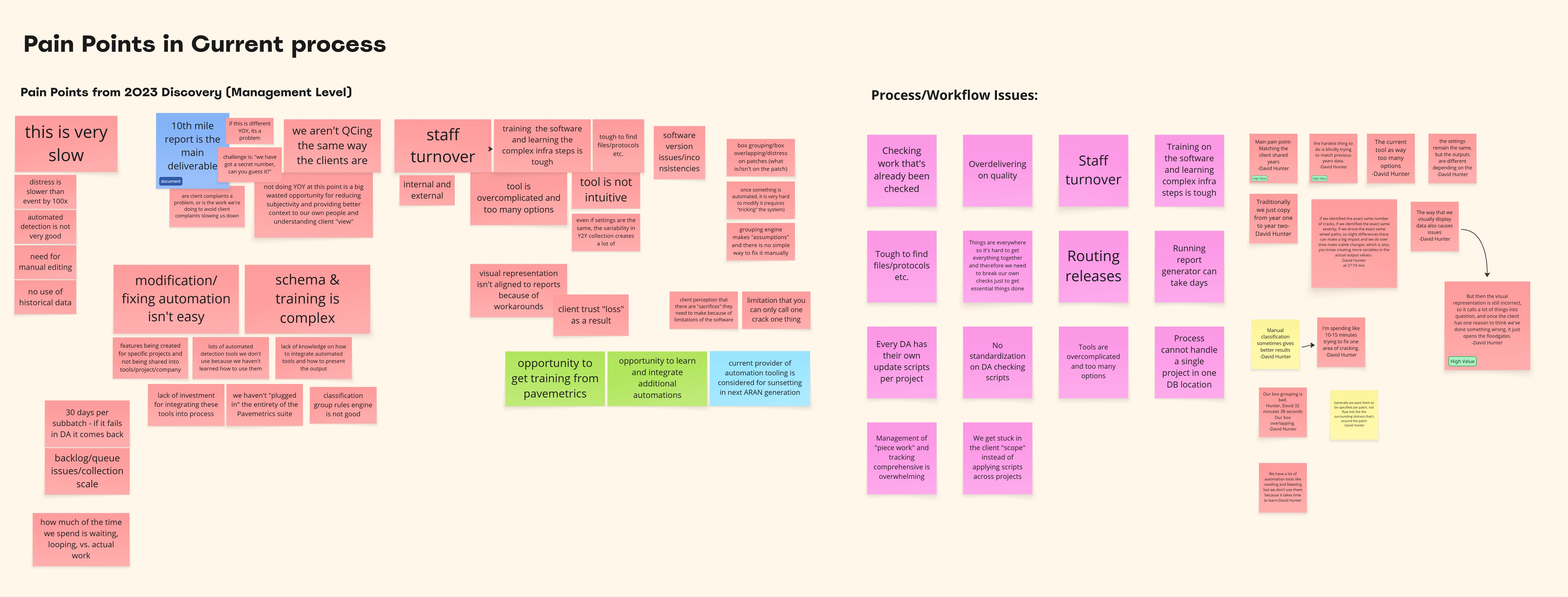 All observations and quotes were consolidated in a Miro board to identify recurring themes and workflow bottlenecks. Each sticky note represented an insight or user quote, which I later grouped into clusters such as automation issues, training gaps, inconsistent outputs, and workflow inefficiencies. This synthesis helped prioritize design opportunities and guided the next phase of ideation.