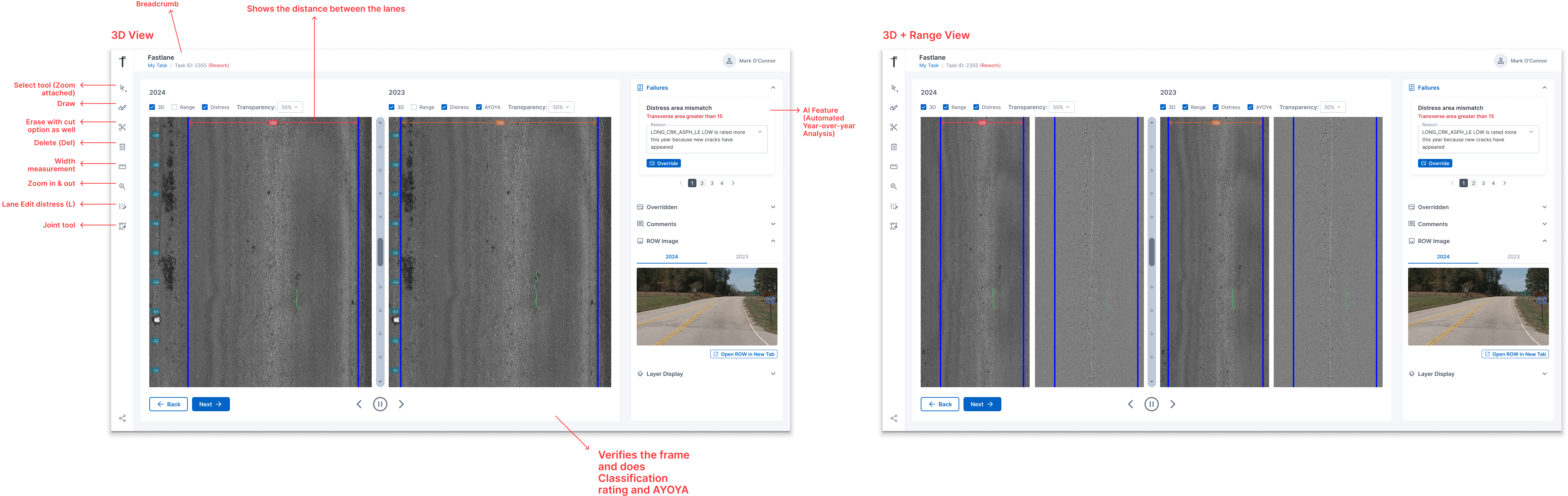 The new userflow consolidates the entire process into a single, connected system tailored to each role — Distress Editor, QC Reviewer, and Delivery Lead. It introduces automation, clear task ownership, and built-in year-over-year comparison to streamline operations. Distress Editors can now view, edit, and verify pavement cracks within one interface, while QC Reviewers can validate, flag errors, and send feedback in real time. The new flow eliminates redundant steps, reduces rework, and enhances transparency across teams.