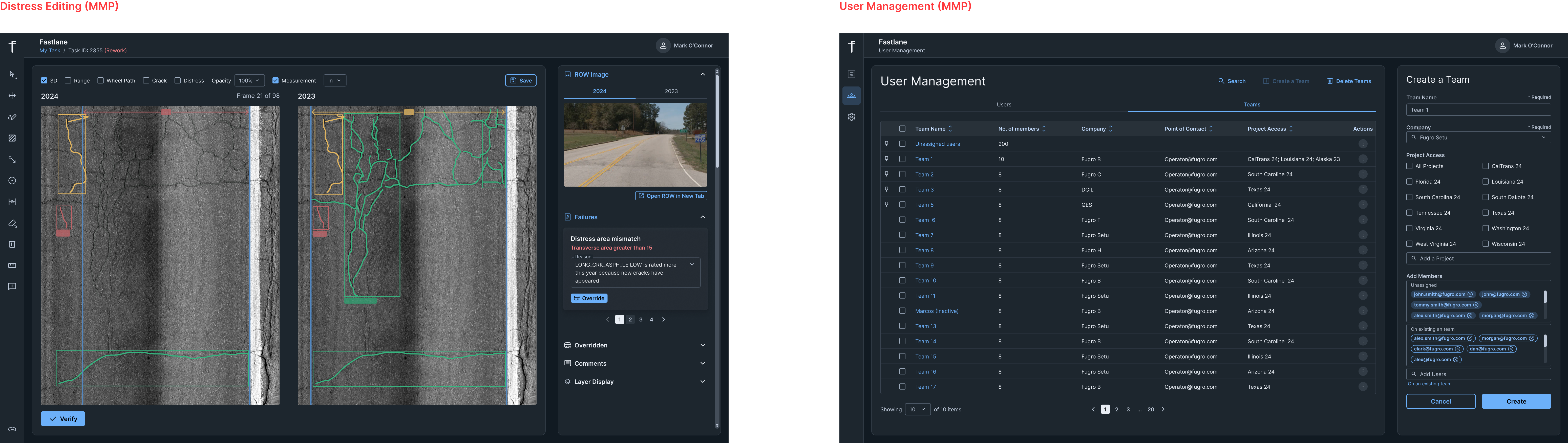 Once the core editing experience was defined, I worked with the team to identify the need for a separate management portal to handle task assignment and oversight. I then created additional wireframes for Project Management and User Management, where leads could assign only the frames that required editing to specific operators, monitor progress, and manage workloads more efficiently. These supporting flows ensured that the distress editing UI was not overloaded with management tasks, while still keeping the overall system connected end to end.