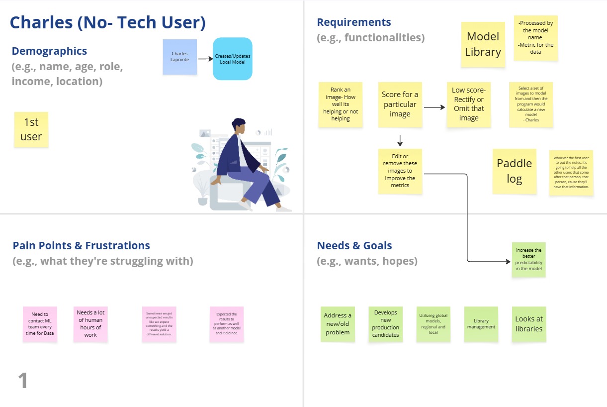 Based on insights from interviews and shadowing sessions, I developed personas representing key user roles — such as ML Engineers, Project Managers, and Geophysicists. These personas captured their goals, frustrations, and workflows, helping maintain a clear user-centered focus throughout the design process. They also guided feature prioritization and ensured that each design decision aligned with real user needs.