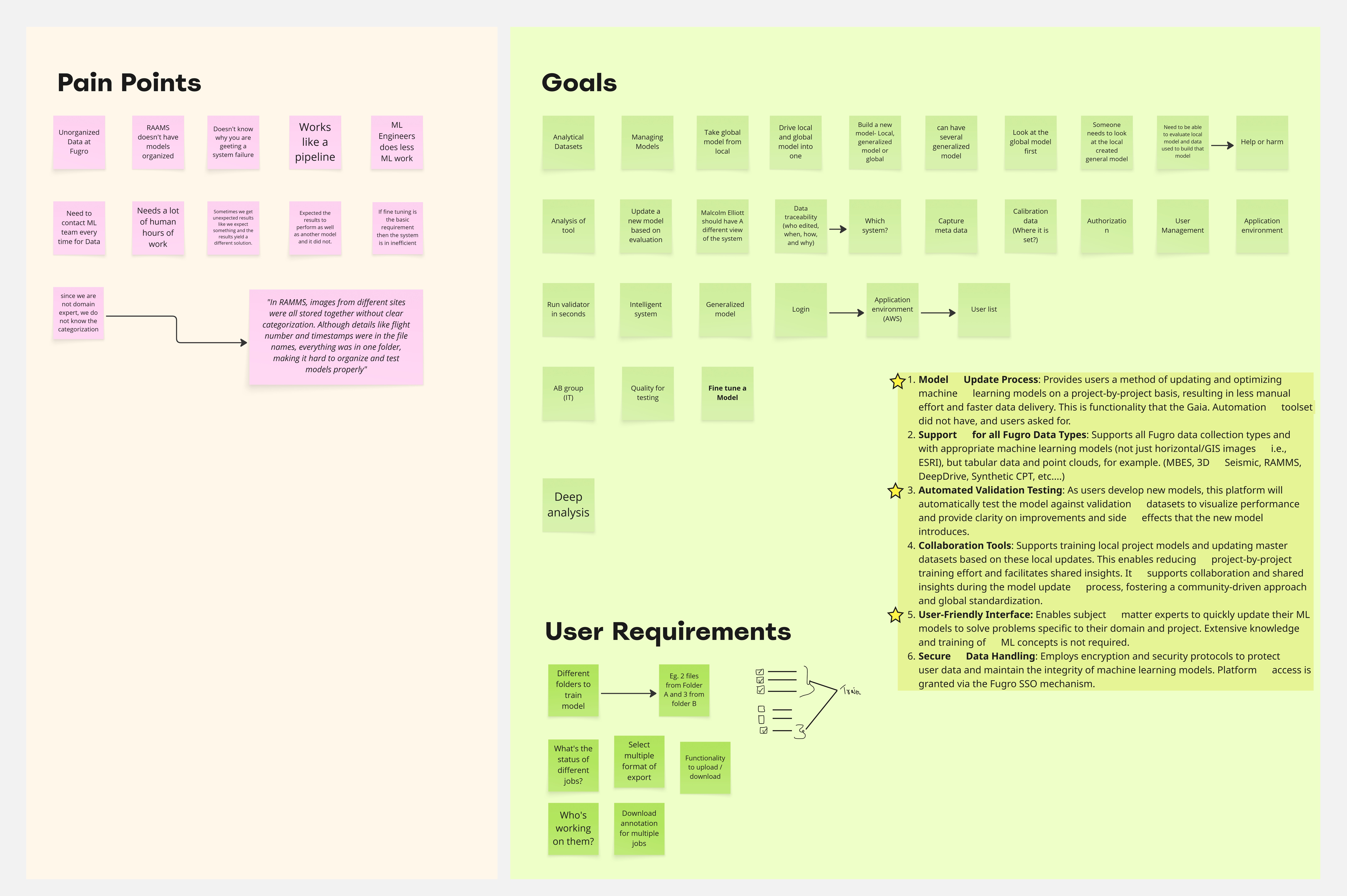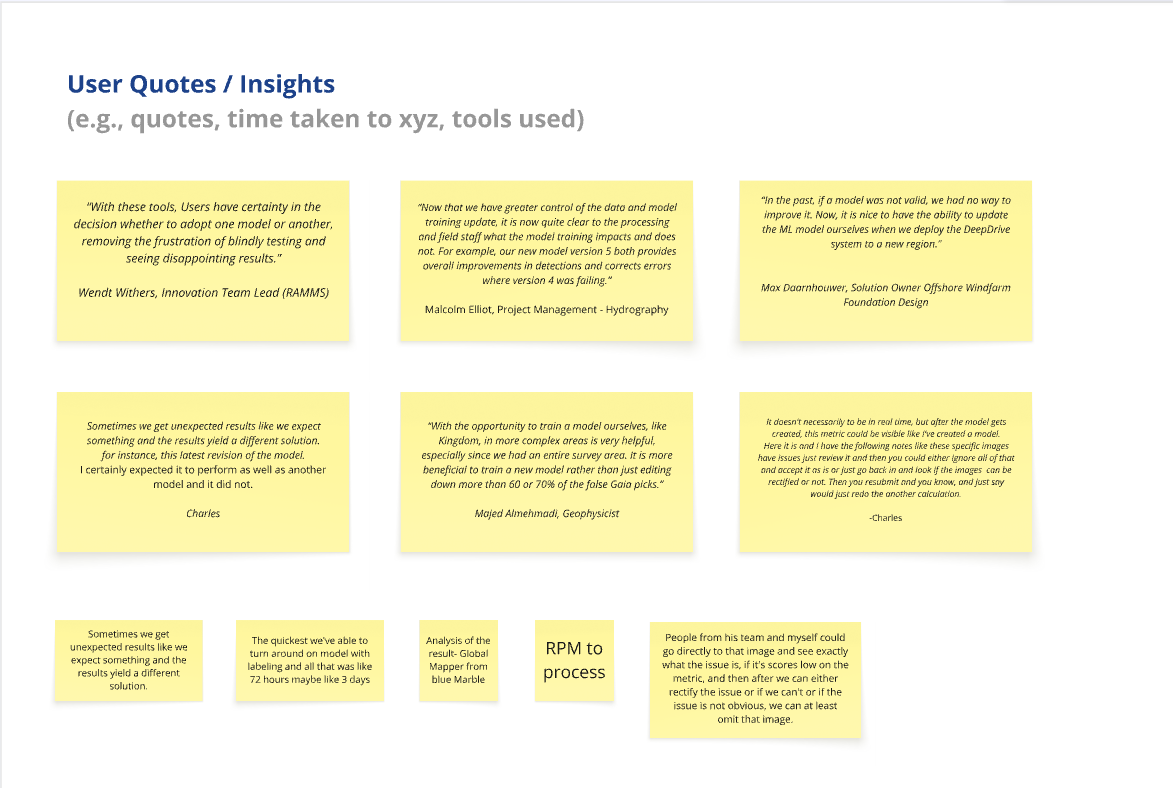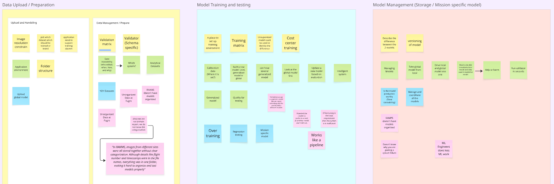 The UX research began with shadow walking sessions to observe how data and ML models were currently managed across projects. Key insights emerged from observing workflows in RAMMS, DeepDrive, and Kingdom applications.