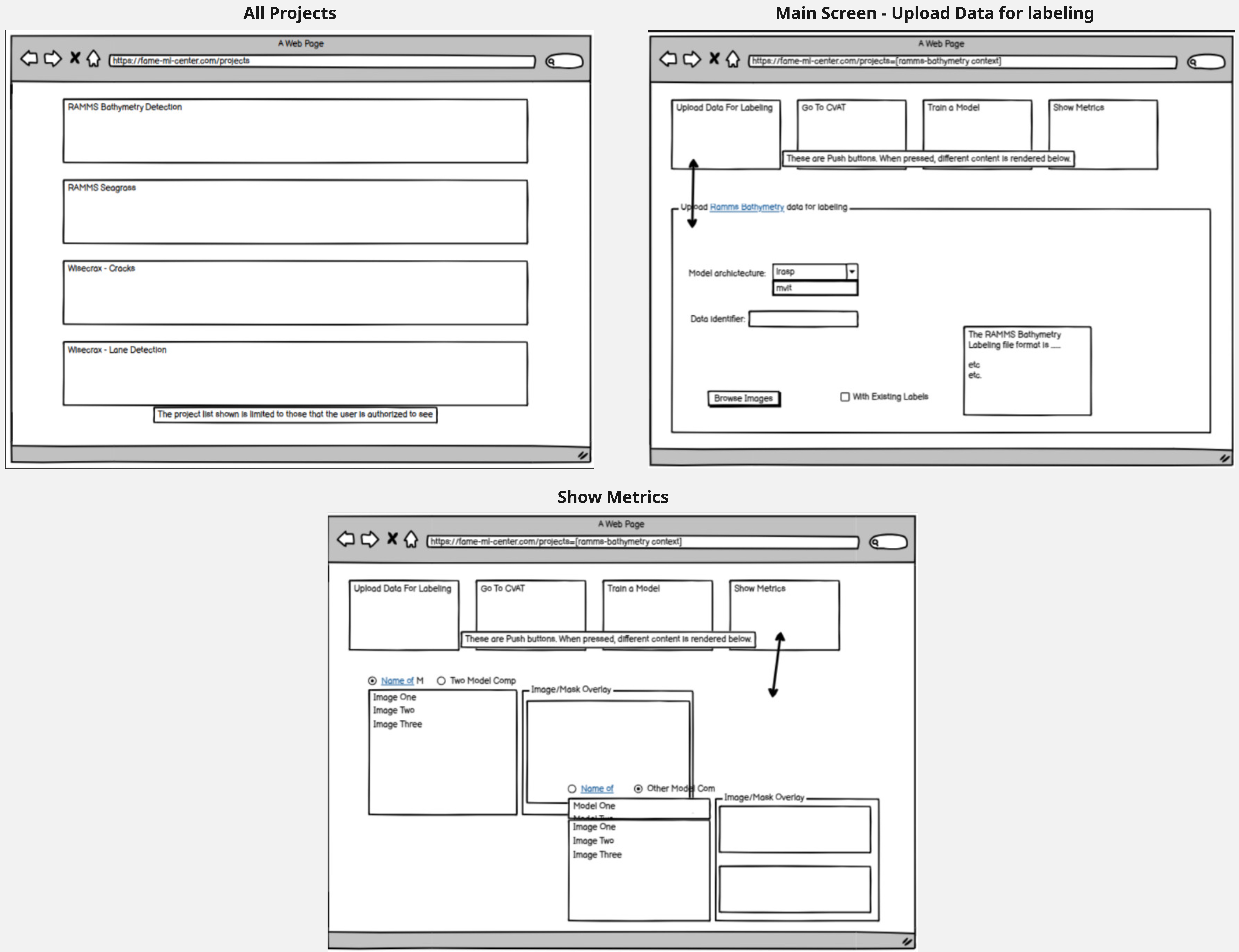 Building on the low-fidelity wireframes, I developed mid-fidelity wireframes to add more detail and structure to the user interface while maintaining focus on usability and workflow. These wireframes incorporated visual hierarchy, interactions, and data presentation elements, reflecting insights from user research and feedback from subject-matter experts. I also drew inspiration from the ML team lead’s initial wireframe, refining layouts and navigation to better support model management, validation, and collaboration tasks. This stage allowed for further iteration and alignment before moving into high-fidelity designs.